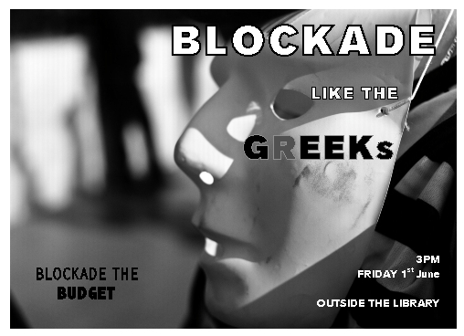 PROTEST LIKE THE GREEKS – BLOCKADE THE BUDGET: The austerity policies introduced in the Government’s Black Budget are an attack on the most vulnerable in society. For students, these include: • Freezing of the parental income threshold (eligibility for allowances are based on this – so less students will qualify for the weekly allowance) • Limit the time you can get the allowance for (so you will have to borrow to live if you want to study longer than 200 weeks – this includes postgraduate degrees, and degrees like medical or law degrees) • Increasing the repayment rate to 12% (further impoverishing those who are already struggling to pay back huge student loans, have mortgages to pay and children to feed) • Further cuts to funding for the Arts and Humanities