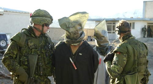 Canadian soldiers lead detainees from a residential compound in Kabul after a raid in 2003