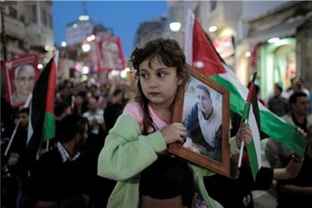 A girl holds a portrait of a Palestinian held in an Israeli jail