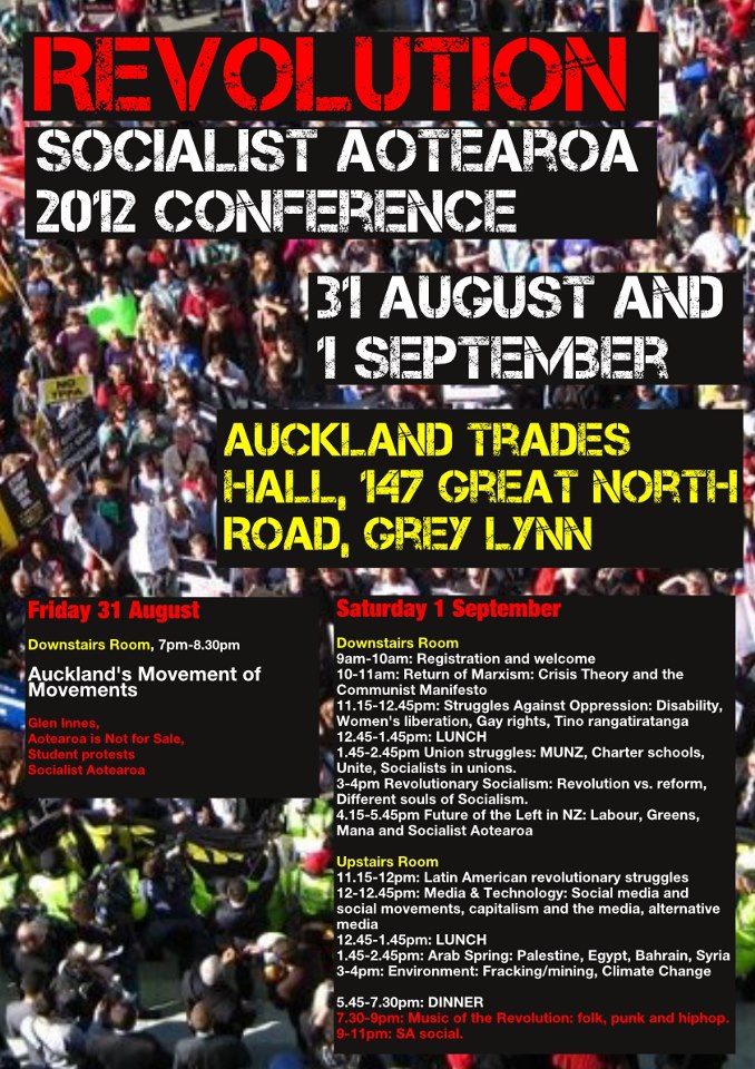 Our 2012 conference begins this Friday and continues over the weekend. We look forward to seeing you over the weekend at what we hope will be the premier conference of the radical left in Auckland this year. It’s a chance to critically assess the key international and national struggles of the last year – the Auckland ports dispute, the education cuts, the Arab Spring, the challenge to asset sales; to examine contemporary political issues – new struggles against oppression, tino rangatiratanga today, Latin America at the crossroads, social media and social movements; and to refresh our theory – Marxism, women’s liberation and socialist environmentalism. For new members and supporters this will be a fantastic introduction to the politics of Socialist Aotearoa. We look forward to seeing you this weekend. If you have questions about the weekend get in touch with us. With speakers including: Russel Mayn, Secretary of Maritime Union Local 13, Meredydd Barrar, Teacher and NZEI activist, Miriam Pieard, Aotearoa is Not for Sale, Steve Mustafa, Bahraini revolutionary, Jayson Gardiner, Mana Party candidate in Tauranga and NZ hip hop producer, Nicola Owen, anti-cuts activist, Mike Treen, Unite Union, Billy Hania, Palestinian activist, Paul Brown, socialist folk musician, Mohammed Hassan, Egyptian activist, Linda Miller, Occupy Auckland activist and many more.