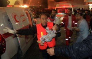 Palestinian medics carry a wounded baby into the al-shifa hospital in Gaza City following an Israeli air strike on November 14, 2012.