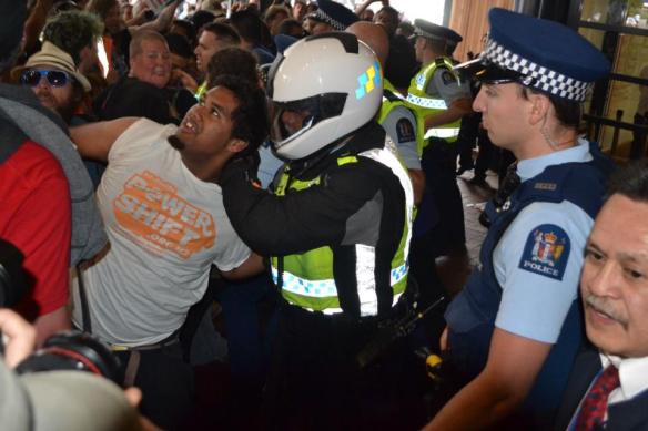 Hi everyone, As a result of the protest against the TPP on 8 December outside Skycity one of our protest group is facing a serious charge of assault with intent to injure a police officer. We are helping to co-ordinate the defence and we need witnesses and video footage of the incident where the police officer with motorbike helmet (Robocop?) grabbed a woman around the neck and wrestled with her on the ground. If you were directly or indirectly involved in the incident please get in touch with us urgently. Please send video footage to mike as well as write down NOW what you actually saw of the incident and send that through as well. You can also call or text John Minto at 0220850161.