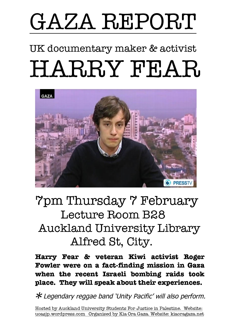 GAZA REPORT – Hear UK documentary maker & activist HARRY FEAR. Harry Fear & veteran Kiwi activist Roger Fowler were on a fact-finding mission in Gaza when the recent Israeli bombing raids took place. They will speak about their experiences. Hosted by Auckland University Students For Justice in Palestine. Website: uoasjp.wordpress.com Organised by Kia Ora Gaza. Website: kiaoragaza.net