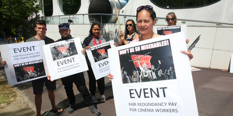 Event Cinema worker Mel Johnston protests with colleagues outside the Auckland headquarters. Photo / Chris Gorman