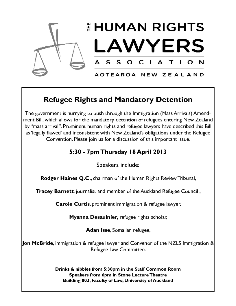 5:30 – 7pm Thursday 18 April 2013. Speakers include: Rodger Haines Q.C., chairman of the Human Rights Review Tribunal; Tracey Barnett, journalist and member of the Auckland Refugee Council; Carole Curtis, prominent immigration & refugee lawyer; Myanna Desaulnier, refugee rights scholar; Adan Isse, Somalian refugee; Jon McBride, immigration & refugee lawyer and Convenor of the NZLS Immigration & Refugee Law Committee. Drinks & nibbles from 5:30pm in the Staff Common Room. Speakers from 6pm.