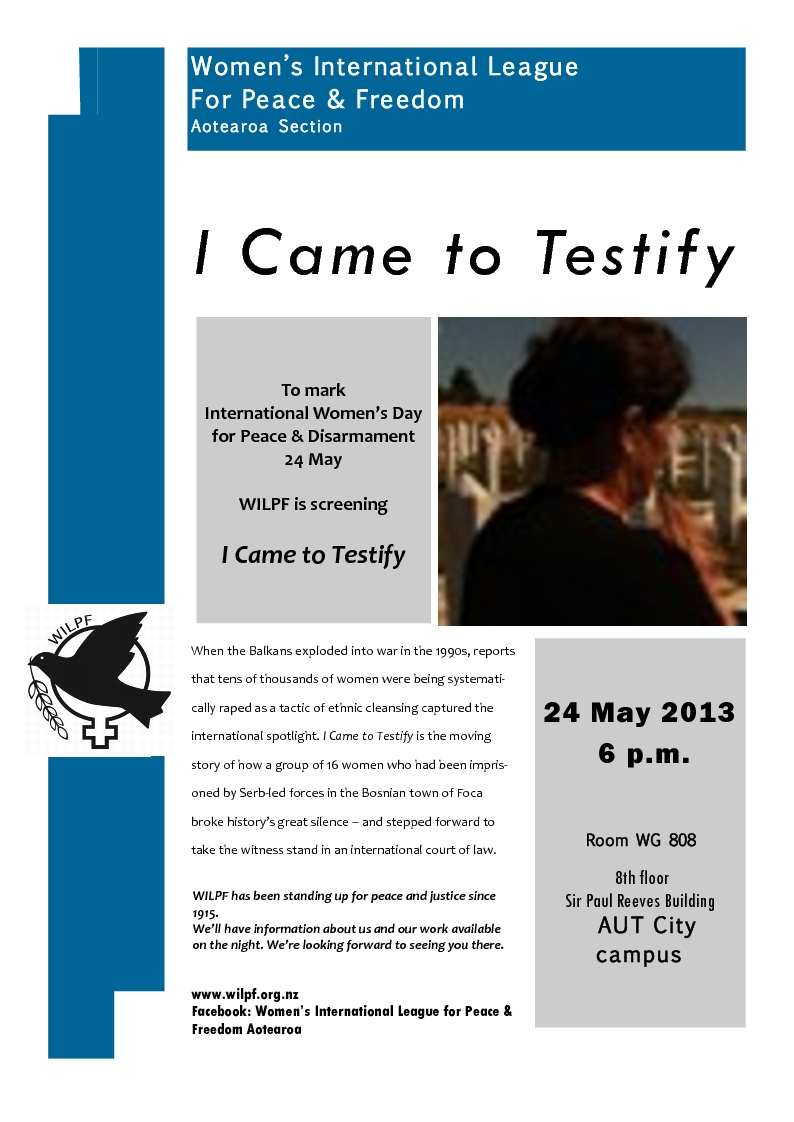 To mark International Women’s Day for Peace & Disarmament 24 May WILPF is screening I Came to Testify. When the Balkans exploded into war in the 1990s, reports that tens of thousands of women were being systemati-cally raped as a tactic of ethnic cleansing captured the international spotlight. I Came to Testify is the moving story of how a group of 16 women who had been impris-oned by Serb-led forces in the Bosnian town of Foca broke history’s great silence – and stepped forward to take the witness stand in an international court of law. www.wilpf.org.nz