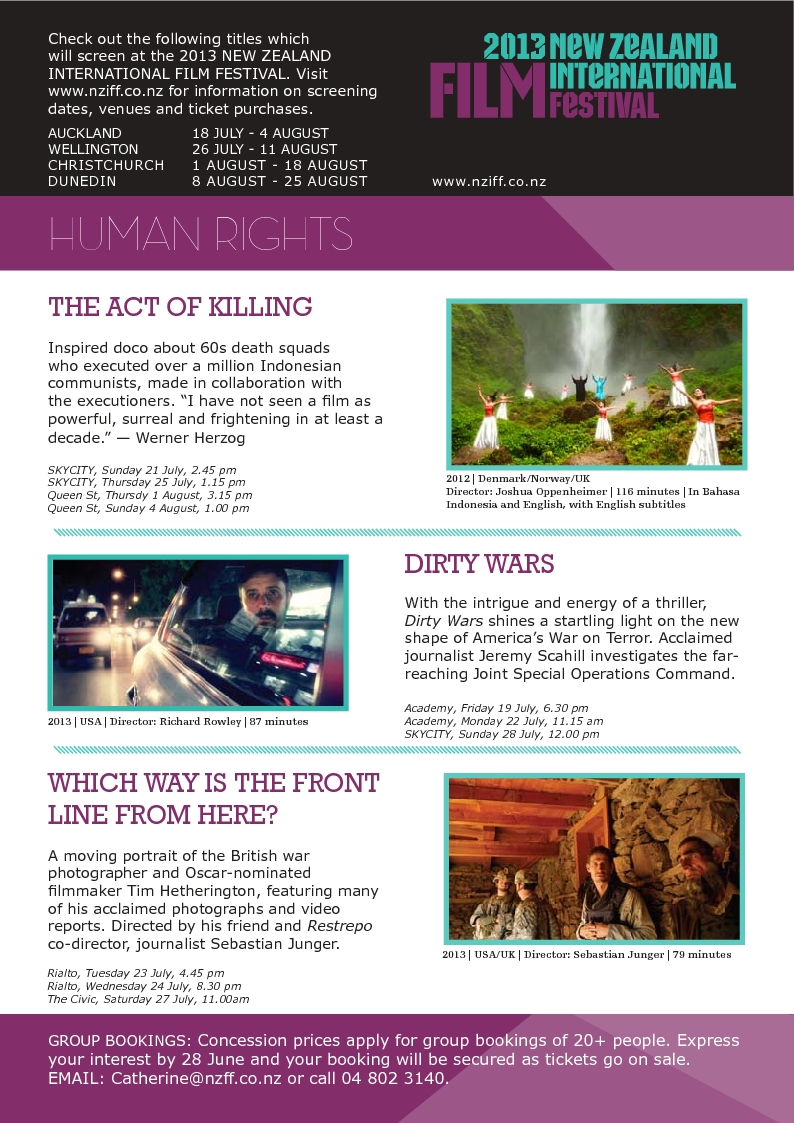 Hi there, Just letting you know about a few of the great films we are screening in the 2013 NZ International Film Festival that will appeal to anyone with an interest in human rights. NZIFF offers great concession rates for groups of over twenty people and can also work with you to run a fundraiser for your organisation. Do let me know if you would like further information about group bookings and fundraisers.