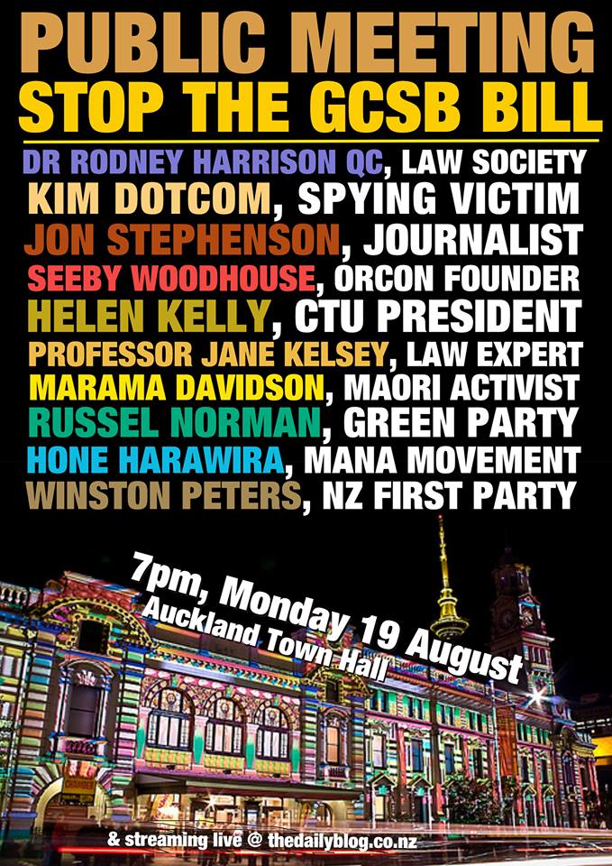 The Coalition to Stop the GCSB Bill has organised a public meeting at the Auckland Town Hall for next Monday 19th August at 7pm.