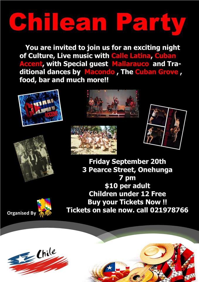 You are invited to join us for an exciting night of Culture, Live music with Calle Latina, Cuban Accent, with Special guest Mallarauco and Traditional dances by Macondo , The Cuban Grove , food, bar and much more!! Estas invitado a participar en la celebración de la Fiesta de Chile que estará llena de cultura, música en vivo con Calle Latina, The Cuban Accent, tradicionales música con Mallarauco bailes con Macondo y Bailes de Salsa con The Cuban grove, comida, bar y mucho mas… buy you Ticket now!! $10 Entry only cash https://www.facebook.com/events/423572647757106/