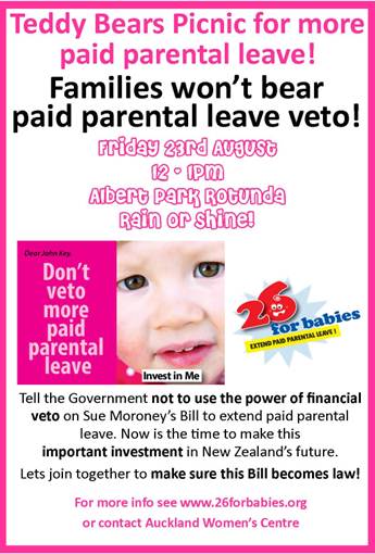 Teddy Bear’s Picnic to Support Paid Parental Leave 26 weeks! And to say a very big loud: DON’T VETO THE BILL, BILL! To date our confirmed speakers are Sue Moroney, Jan Logie, Marama Davidson and Carmel Sepuloni https://www.facebook.com/events/196478883847114/