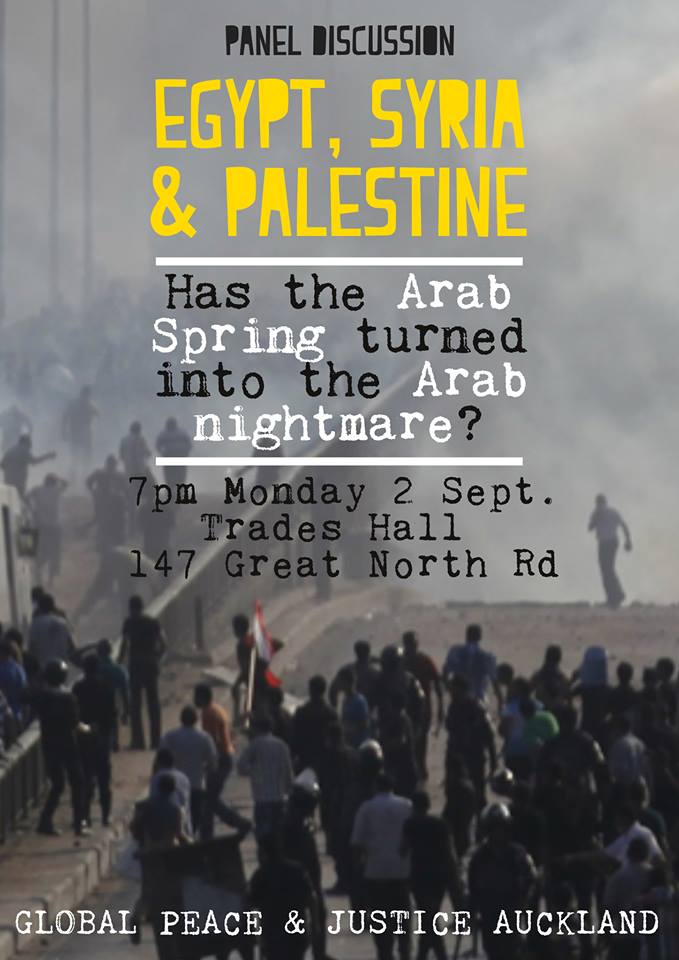 Global Peace and Justice Auckland is planning a forum on Syria and the wider Arab world for this coming Monday (2nd September at 7pm at Trades Hall, 147 Great North Road) . The Title is “Egypt, Syria and Palestine – has the Arab Spring turned into the Arab nightmare?” and we are inviting you to take part as a part of a panel discussion involving: