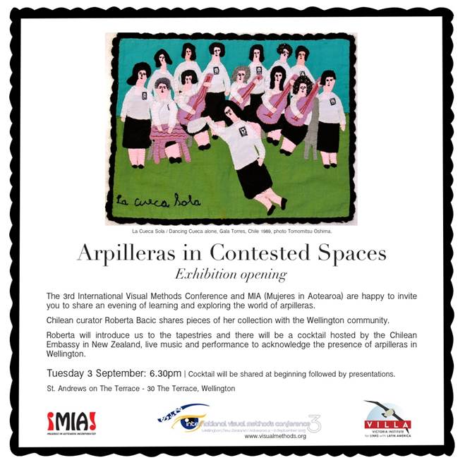 Invitation – Arpilleras Exhibition Opening. Dear friends, We are very happy to invite you to the opening of the exhibition “Arpilleras in Contested Spaces” next Tuesday 3 September, 6.30 at St Andrews in The Terrace. Arpilleras are hand sewn tapestries shaped by a history of resistance. They began to be created in Chile by the families of the victims of the dictatorship, and since then they have served as an expression of different struggles in different contexts and continents. We are therefore very proud to have a selections of arpilleras coming to Aotearoa New Zealand. This event will include a cocktail, music, poetry and dance, and will also mark the anniversary of the 40 years of the coup d’état by Pinochet in Chile. It is part of the Third International Visual Methods Conference (http://visualmethods.org/). We hope you can join us in such special event, and take some time to visit the exhibition. This exhibition will be open from Tuesday to Friday next week, see the other flyer attached (“exhibition”) for opening hours. Un abrazo, Marcela
