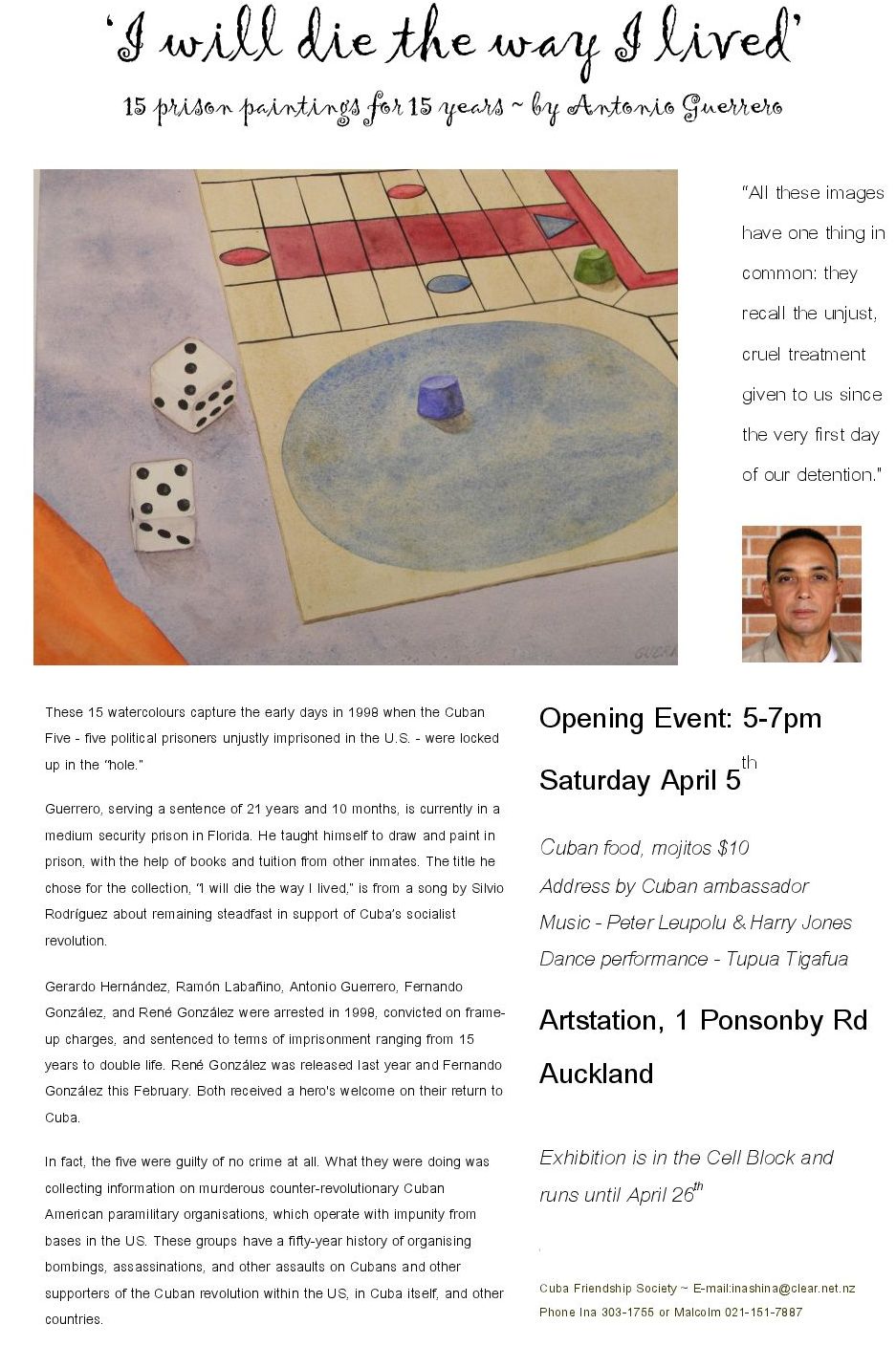 “I will die the way I lived” is an exhibition of 15 paintings by Antonio Guerrero, one of the Cuban Five, who is unjustly imprisoned in the United States. The opening event is on Saturday, April 5 from 5-7pm, at Artstation, 1 Ponsonby Road, central Auckland. The exhibition runs until April 24. The April 5 event will begin with Cuban food and mojitos. The Cuban ambassador, Maria del Carmen Herrera, will open the exhibit. There will be dance and music performances by Tupua Tigafua, Peter Leupolu, and Harry Jones and friends. The Cuba Friendship Society in Auckland is organising this exhibition to build support for the international campaign to free the Cuban Five. Please come along and bring others. Attached is a leaflet that can be used to tell others about the opening event and exhibition. If you want to offer your assistance in any way, please reply to this email or phone Ina (09) 303-1755 or Malcolm 021-151-7887.