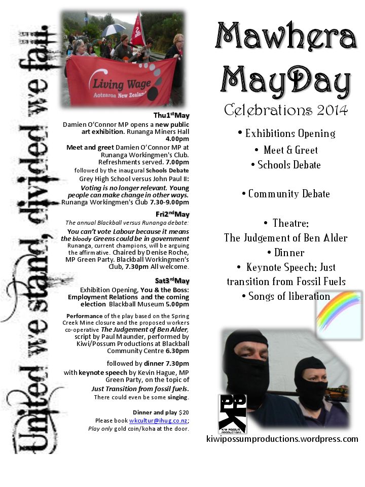 Exhibition Opening, You & the Boss: Employment Relations and the coming election. Blackball Museum 5.00pm. Performance of the play based on the Spring Creek Mine closure and the proposed workers co-operative The Judgement of Ben Alder, script by Paul Maunder, performed by Kiwi/Possum Productions at Blackball Community Centre 6.30pm followed by dinner 7.30pm with keynote speech by Kevin Hague, MP Green Party, on the topic of Just Transition from fossil fuels. There could even be some singing. Dinner and play $20. Please book wkcultur; Play only gold coin/koha at the door.