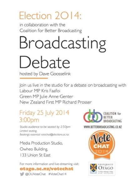 Broadcasting Debate with Kris Faafoi – Labour, Julie Anne Genter – Greens, Richard Prosser – NZFirst. Come along to see the opposition broadcasting policies put under the microscope by TV3 Reporter, Dave Goosselink. Book your seat at votechat Even if you’re not in Dunedin, you can watch this debate live (and afterwards) at betterbroadcasting Big thanks to VoteChat for making this possible.