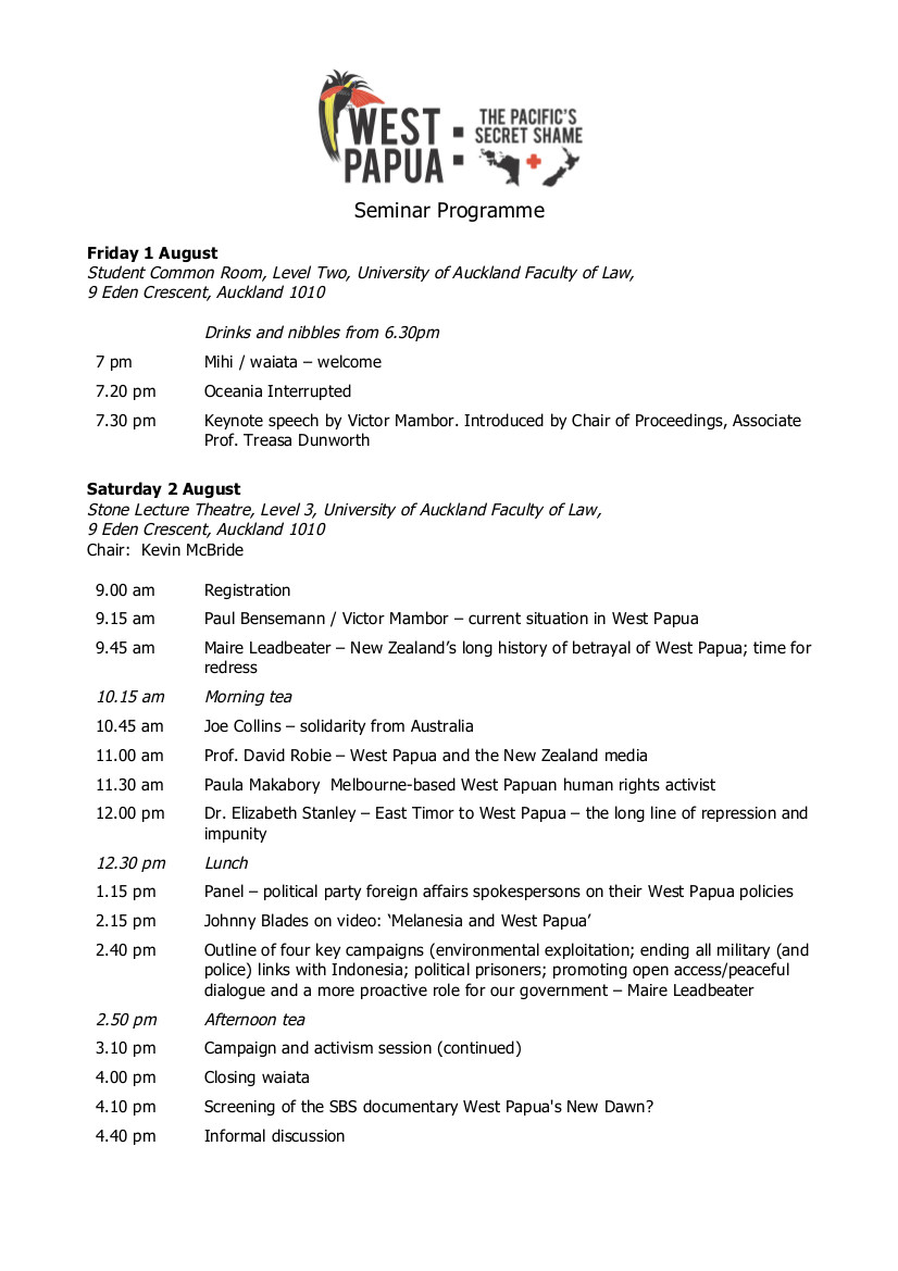 Keynote speaker: Victor Mambor, Chairperson for the Alliance of Independent Journalists (Papua chapter). Other speakers include: Prof. David Robie (Director, Pacific Media Centre, AUT); Dr. Elizabeth Stanley (Victoria University of Wellington); Maire Leadbeater (Human Rights activist); Paul Bensemann (Independent NZ journalist); Johnny Blades (Radio NZ journalist – via video link); Paula Makabory (West Papuan human rights activist, Melbourne) tbc