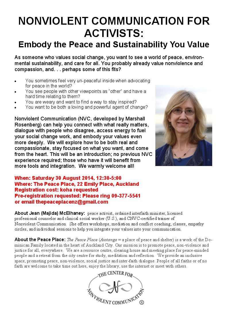 Just letting you know that the Peace Place will be hosting an Introduction to NVC for Activists workshop on Saturday 30 August from 12.30-5pm. Details below: NONVIOLENT COMMUNICATION FOR ACTIVISTS: Embody the Peace and Sustainability You Value. As someone who values social change, you want to see a world of peace, environmental sustainability, and care for all. You probably already value nonviolence and compassion, and. . . perhaps some of this fits?