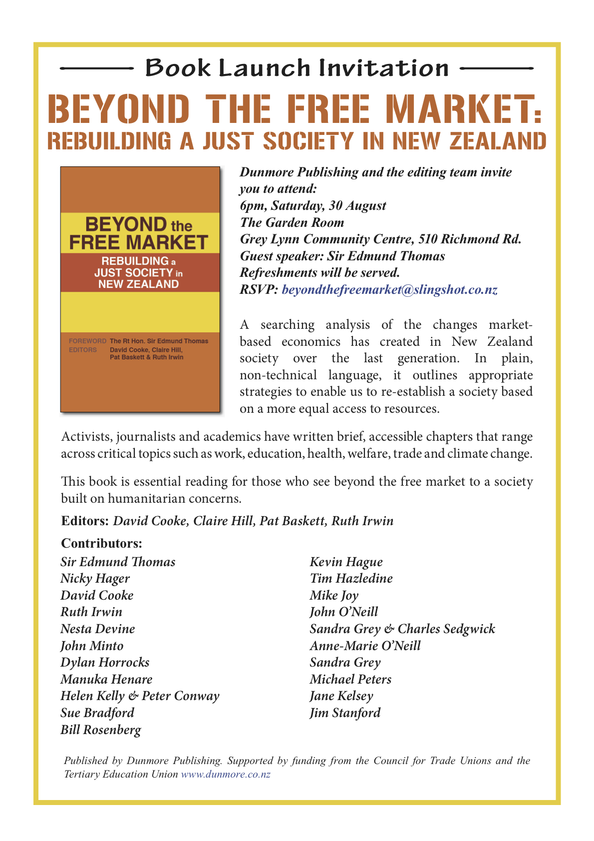 Book Launch Invitation: Beyond the Free Market: Rebuilding a Just Society in New Zealand. Contributors include Nicky Hager, Sue Bradford, Peter Conway, Tim Hazledine, Mike Joy, Kevin Hague, Helen Kelly, John Minto, Bill Rosenberg, The Rt Hon Sir Edmund Thomas, Manuka Henare, Jane Kelsey, John O’Neill – what a wonderful cast! Edited by David Cooke, Claire Hill, Pat Baskett and Ruth Irwin; supported by funding from the Council for Trade Unions and the Tertiary Education Union; published by Dunmore www.dunmore.co.nz
