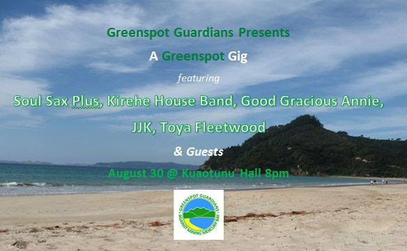 It’s time for some fun! It’s really cold, we’ve been working hard and so many people have been asking us to do another so…… Greenspot Guardians are pleased to present a Greenspot Gig featuring: Soul Sax Plus, Good Gracious Annie (formerly Gentle Annie) ; The Kirehe House Band; JJK; Toya Fleetwood and guests playing a range of originals and cover music including blues, folk, rock, country/bluegrass and more. Pre-sale tickets $15 waged, $10 unwaged (not working) available from the Cave, Health 2000 and the Kuaotunu Store, you can email us or $20 on the door on the night. It’s BYO, and snacks/refreshments will be available for sale on the night – and there’ll be spot prizes! Like last time there will also be an open mic/jam session, so bring an instrument if you want! Last years was really fun – reminiscent of the anti-mining parties of the 1980’s… great vibe, great sounds and great cause! So, grab a ticket, come along and support us – and help to ensure that our beautiful corner of the world stays mine free! And have a great time doing it! The party is on and it’s is going to be a great night! Hope to see you there, Augusta, Kale and the Greenspot Guardians Team
