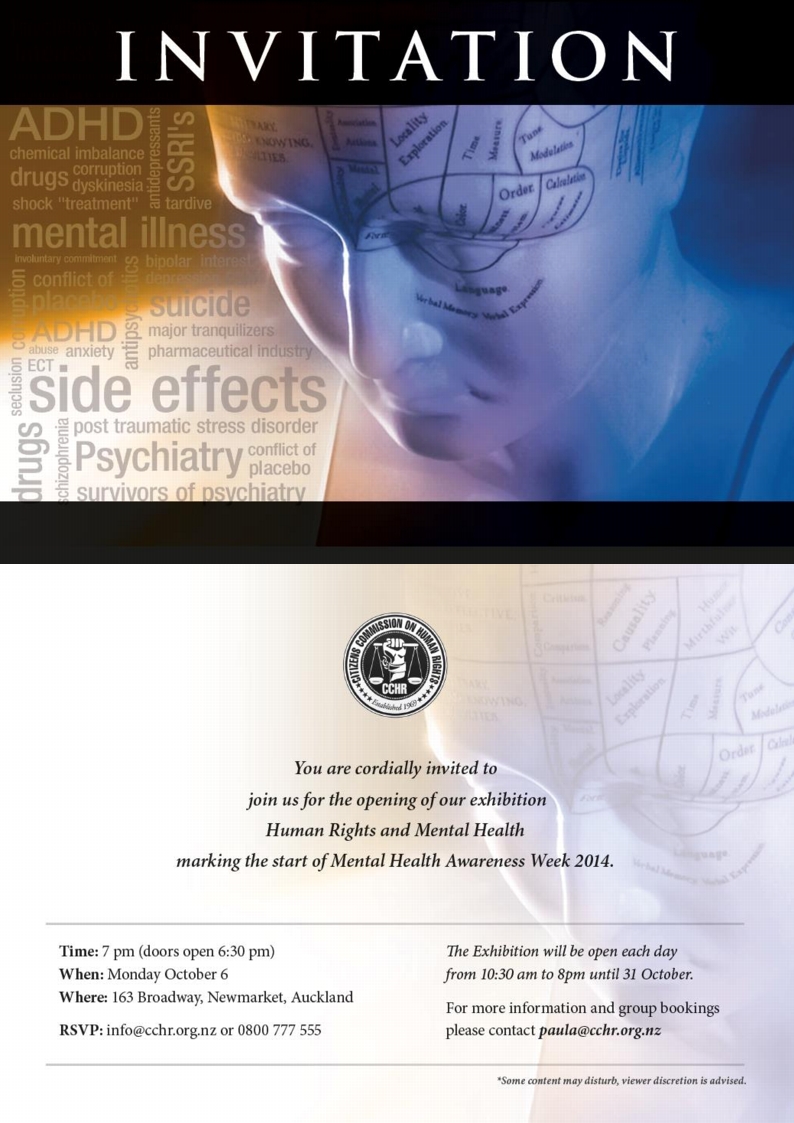 Launch of Mental Health Awareness Week 2014 with the Grand Opening of the CCHR NZ Mental Health and Human Rights Exhibition 6 October at 7.00pm (doors open at 6.30pm).