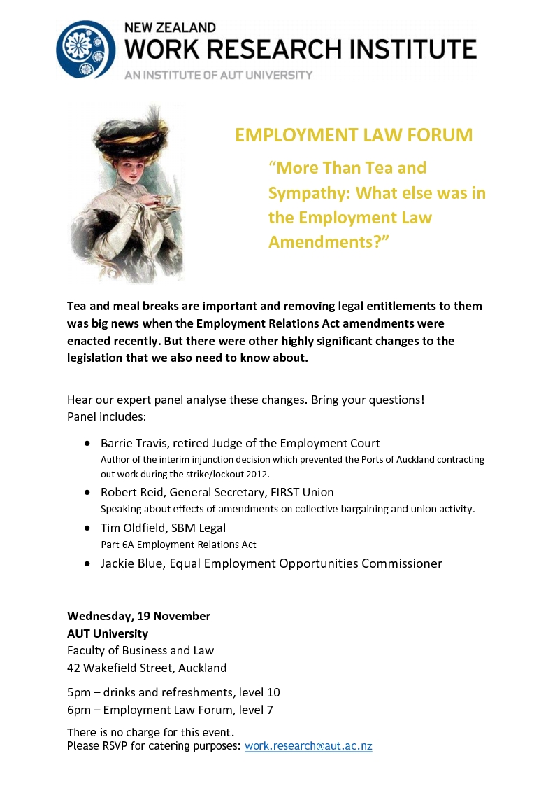 The NZ Work Research Institute invites you to this event hosted by its Employment Law Forum. Tea and meal breaks are important and removing legal entitlements to them was big news when the Employment Relations Act amendments were enacted recently. But there were other highly significant changes to the legislation that we also need to know about. Hear our expert panel analyse these changes. work.research