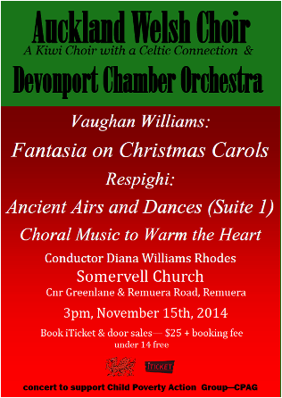 Auckland Welsh Choir and Devonport Chamber Orchestra Benefit Concert for Child Poverty Action Group. The programme includes Vaughan Williams Fantasia on Christmas Carols; Respighi Ancient Airs and Dances (orchestra) and Songs to Warm the Heart – choir and orchestra variously. Tickets $25 through iticket (booking fee applies) door sales, or through choir members. Any queries, please contact Judith McMorland, MET member, 528 0252 or judith