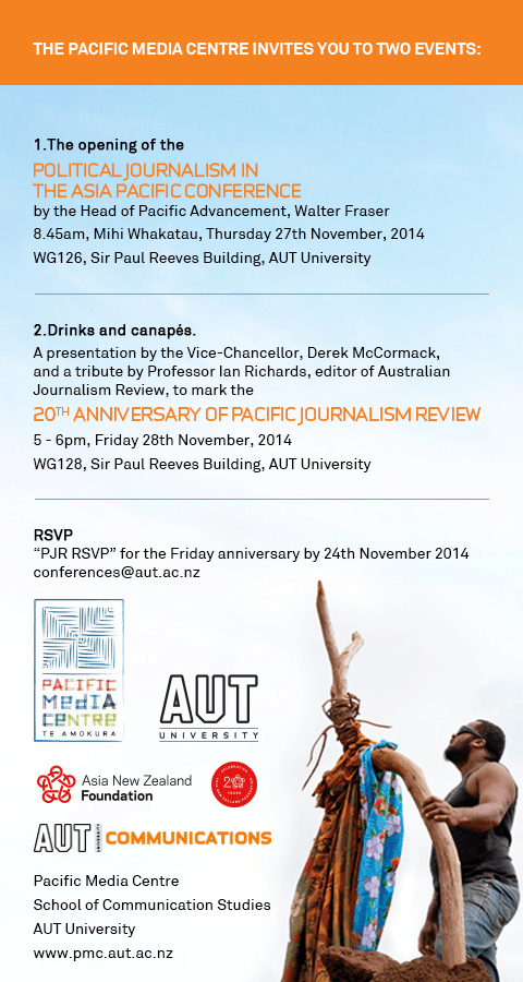 Political journalism in the Asia-Pacific. A three-day human rights, social justice and media freedom conference is being hosted by the Pacific Media Centre at AUT University next month to mark 20 years of publishing the Pacific Journalism Review research journal. A special edition is being distributed at the conference and a book issue will be published early next year drawing from papers at the conference on November 27, 28 and 29. Papers include asylum seekers, state surveillance, climate change, murders of journalists with impunity in the Philippines and other countries, e-martial law, Fiji’s return to “democracy”, Māori and indigenous representation, West Papuan self-determination and a host of other issues. Two feature films are also being screened, Cap Bocage and Hot Air. Conference website: http://www.pmc.aut.ac.nz/articles/pjr-20th-anniversary-conference