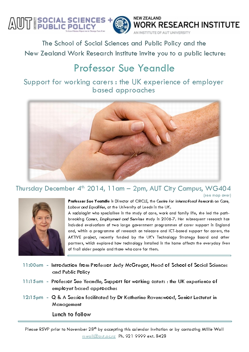 You are invited to attend a public lecture by Professor Sue Yeandle, Director of CIRCLE, the Centre for International Research on Care, Labour and Equalities, at the University of Leeds in the UK. On “ Support for working carers : the UK experience of employer based approaches”