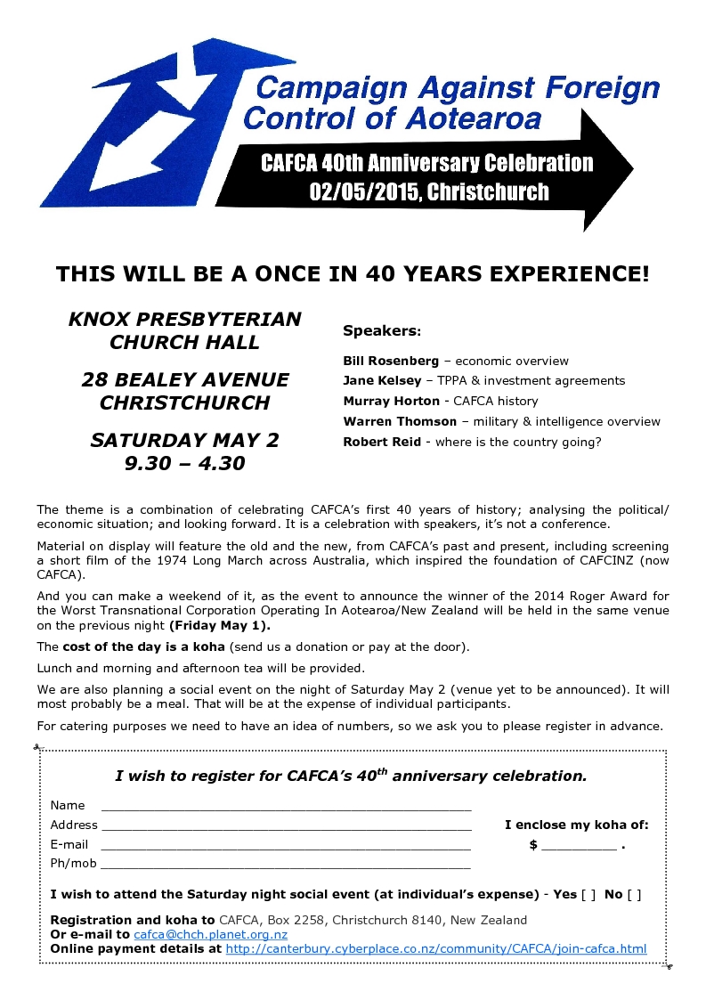 See the flyer below for details such as venue, speakers, topics. The flyer is also online at cafca/ www.cafca.org.nz / Facebook: http://tinyurl.com/cafcafb / Watchblog: http://tinyurl.com/watchblog / twitter:@NZN4S