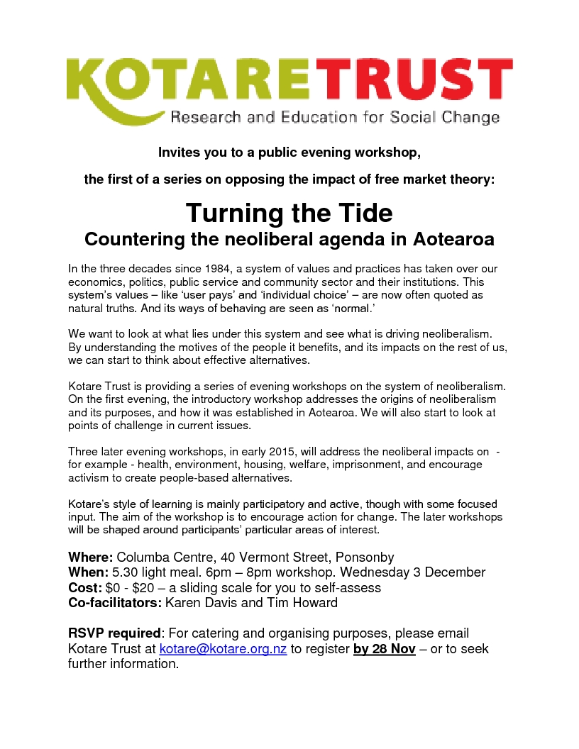 Kotare Trust: Research and Education for Social Change Invites you to a public evening. Workshop, the first of a series on opposing the impact of free market theory: