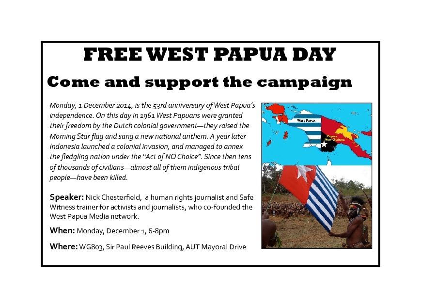 Changing Tides – Free West Papua: Be part of the audience that supports the raise the flag on December the 1st, in honour of the quest for West Papuan Independence. Please some kai/finger food to share and a raincoat as the performance will go ahead rain, hail or shine. Our limited edition Freedom Is… T-shirts will be for sale for a special price of $25. Badges will be for sale for $2. For more info: https://www.facebook.com/OceaniaInterrupted and http://oceaniainterrupted.com/