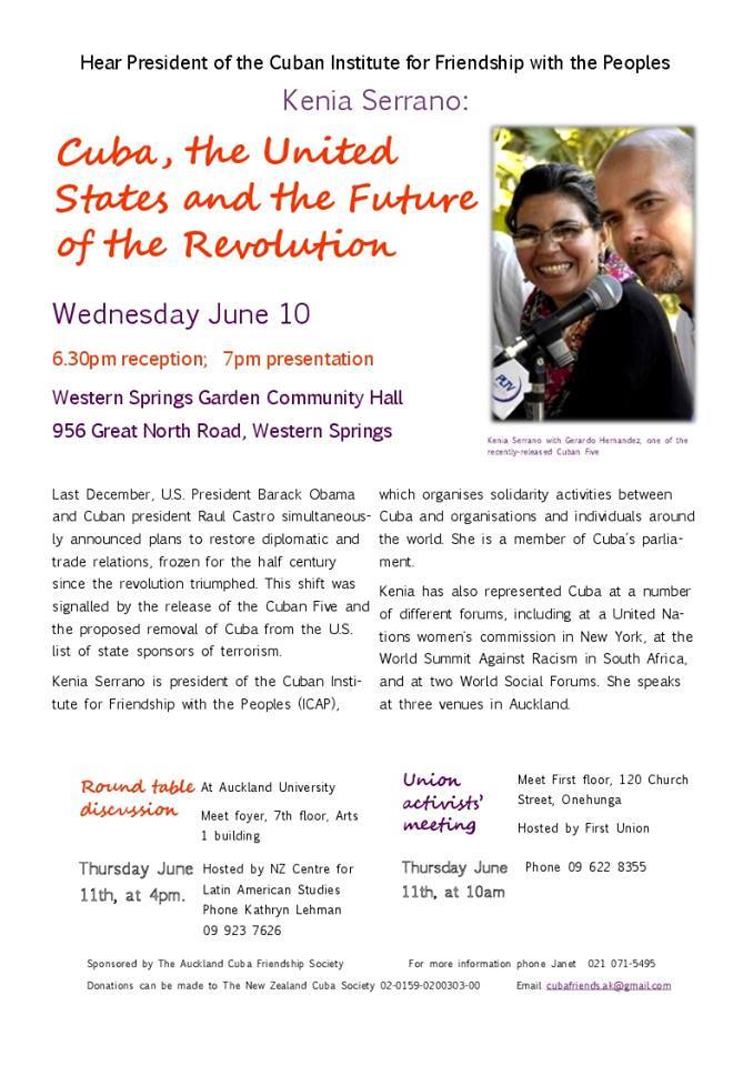 Meet Cuban leader Kenia Serrano in Auckland. The Cuba Friendship Society invites you to a public meeting on June 10 with Kenia Serrano, the president of the Cuban Institute for Friendship with the Peoples (ICAP) and a member of Cuba’s parliament. Kenia is a dynamic leader of a new generation helping to build ties with the Cuban revolution around the world. The meeting is on Wednesday, June 10 at the Western Springs Garden Community Hall, 956 Great North Road. The evening begins with a reception at 6.30pm, Kenia will be welcomed and then speak at 7pm, and there will be an opportunity for questions and answers afterwards. There are also a couple of opportunities to meet with Kenia on Thursday, June 11. A meeting for union activists is being hosted by First Union at 10.30am and a round table discussion is being hosted by the New Zealand Centre for Latin American Studies at the University of Auckland at 4pm. The publicity for the tour is below with a pdf file attached. You can share the event on facebook at https://www.facebook.com/events/832262166853709/ The Auckland Cuba Friendship Society is covering the cost of Kenia’s travel from Australia, where she is a guest of the Australia Cuba Friendship Societies. We are appealing for funds to help us make this visit possible. We anticipate the visit will cost about $1,000. If you wish to donate online, the New Zealand Cuba Society account number is 02-0159-0200303-00. Please drop us an email so we can confirm that donations have been received.