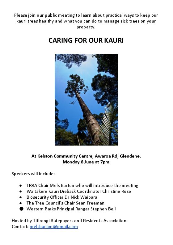 Titirangi R&R Assoc are hosting another public meeting, this time on kauri dieback disease – and trying to focus on the practical things people can do to better protect their trees rather than just doom & gloom. We want to encourage anyone living or working in areas with kauri to attend. Contractors such as plumbers, builders, fencers, gardeners, landscapers, arborists, road workers may all be at risk of spreading the disease & we encourage them to attend. Ditto dog walkers, runners, mountain bikers, trampers.