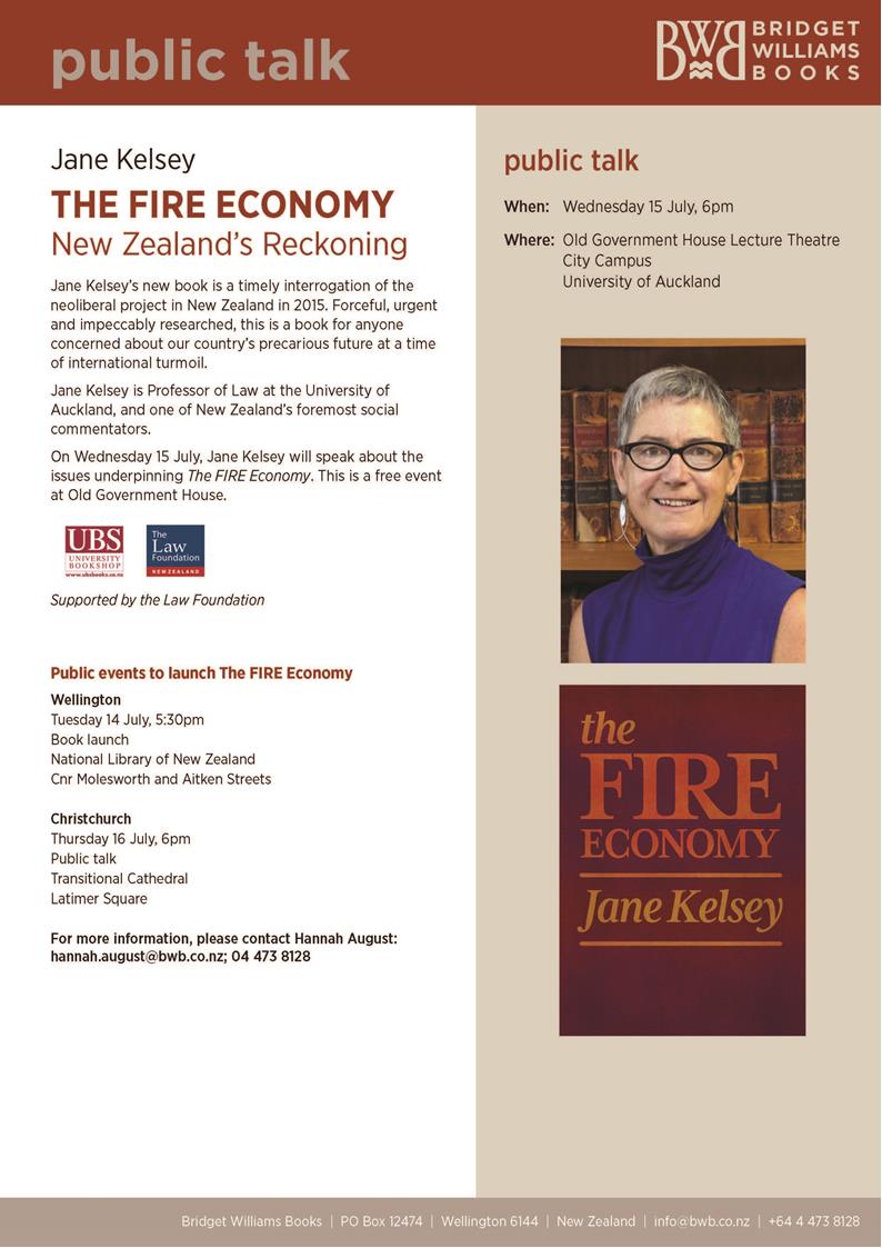 UncategorizedBook launch: Jane Kelsey, The FIRE Economy, WED 15 July 6pm, Old Govt House Auck Uni Share this: Click to print (Opens in new window) Print Click to share on Facebook (Opens in new window) Facebook Click to share on X (Opens in new window) X Click to email a link to a friend (Opens in new window) Email Like Loading... Related
