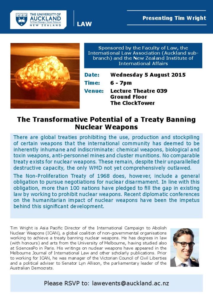 Transformative Potential of a Treaty Banning Nuclear Weapons: Lecture by Tim Wright. Sponsored by the Faculty of Law, the International Law Association and the NZ Institute of International Affairs, Tim Wright, Asia Pacific Director of the International Campaign to Abolish Nuclear Weapons will talk about the need for a Treaty to ban nuclear weapons. Despite the nuclear non-proliferation treaty there is no ban. Tim will talk about the global and humanitarian advantage to promoting the development of a nuclear weapons ban. RSVP to lawevents
