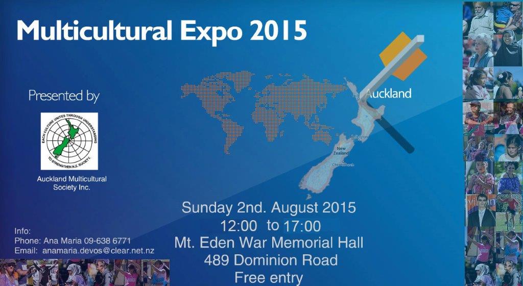 The Auckland Multicultural Society invites your group to take part in the Multicultural Expo 2015 on Sunday 2nd. August 2015. The Expo 2015 theme: Traditional children’s rhymes. Information Stalls: We will provide a table, two chairs and display board for your group to promote your activities. Your group can display photos and a couple from your group dressed in traditional clothes. Your stall will need to be attended at all times (you might like to use a roster system). Each group will be allocated 8 minutes spot on stage to explain their activities. This is a great opportunity to attract new members. You might include a short performance in your 8 minutes spot. The information stalls are not allowed to sell any products. Food: 3 selected cultural groups representing three different continents will be selling food in the kitchen area. Ana Maria anamaria.devos