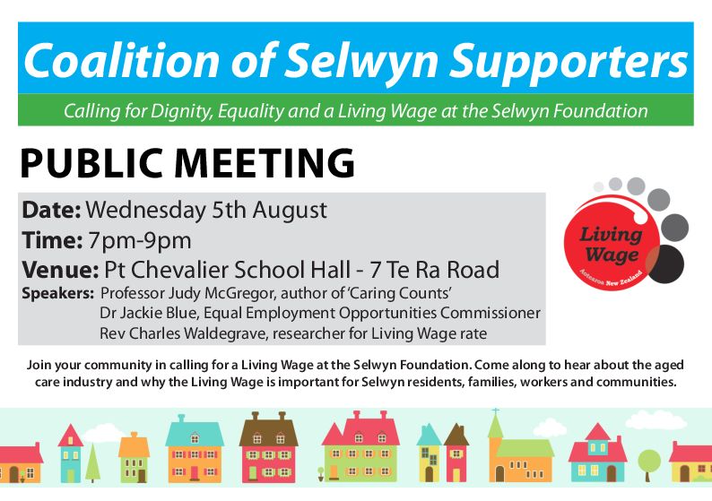 The Coalition of Selwyn Supporters is calling for dignity, equality and a Living Wage at the Selwyn Foundation. Come along to hear about the aged care industry and why the Living Wage is important for Selwyn residents, families, workers and communities.