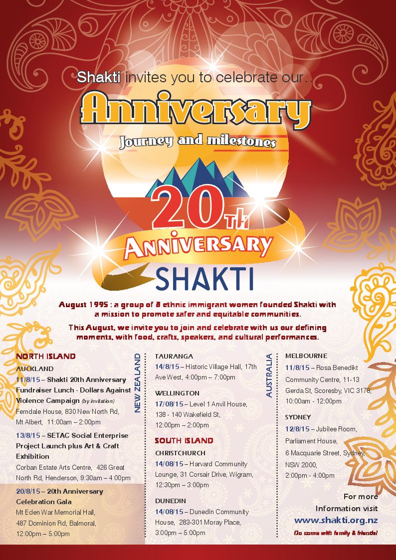 Therefore the time has come for us to celebrate a major milestone – our total of 20 years of having serviced vulnerable migrant and refugee ethnic communities in New Zealand and Australia. It is also time to celebrate the freedom and empowerment women and children have gained through Shakti’s support; to celebrate the social impact that we have made as an ethnic organisation as well as inter-generational social change. We look forward to seeing you there!