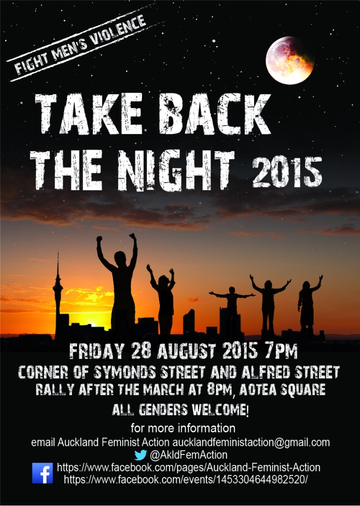 Organised and led by Auckland Feminist Action, the Take Back the Night march, which is part of a global initiative, will walk, dance and chant their way through the central city, starting at 7pm from the corner of Symonds and Alfred Streets. The march will conclude with a rally in Aotea Square at 8pm where representatives of local groups will speak about the right to safety against violence. This year the march was organised to celebrate communities coming together to reclaim the right to walk our city at night – indeed all the time – without fear. Mindful of the need for rape law reform and that the Law Commission’s report on sexual violence trials is due to be released in September, the objective is to bring the issue of sexual violence and rape culture to the forefront!