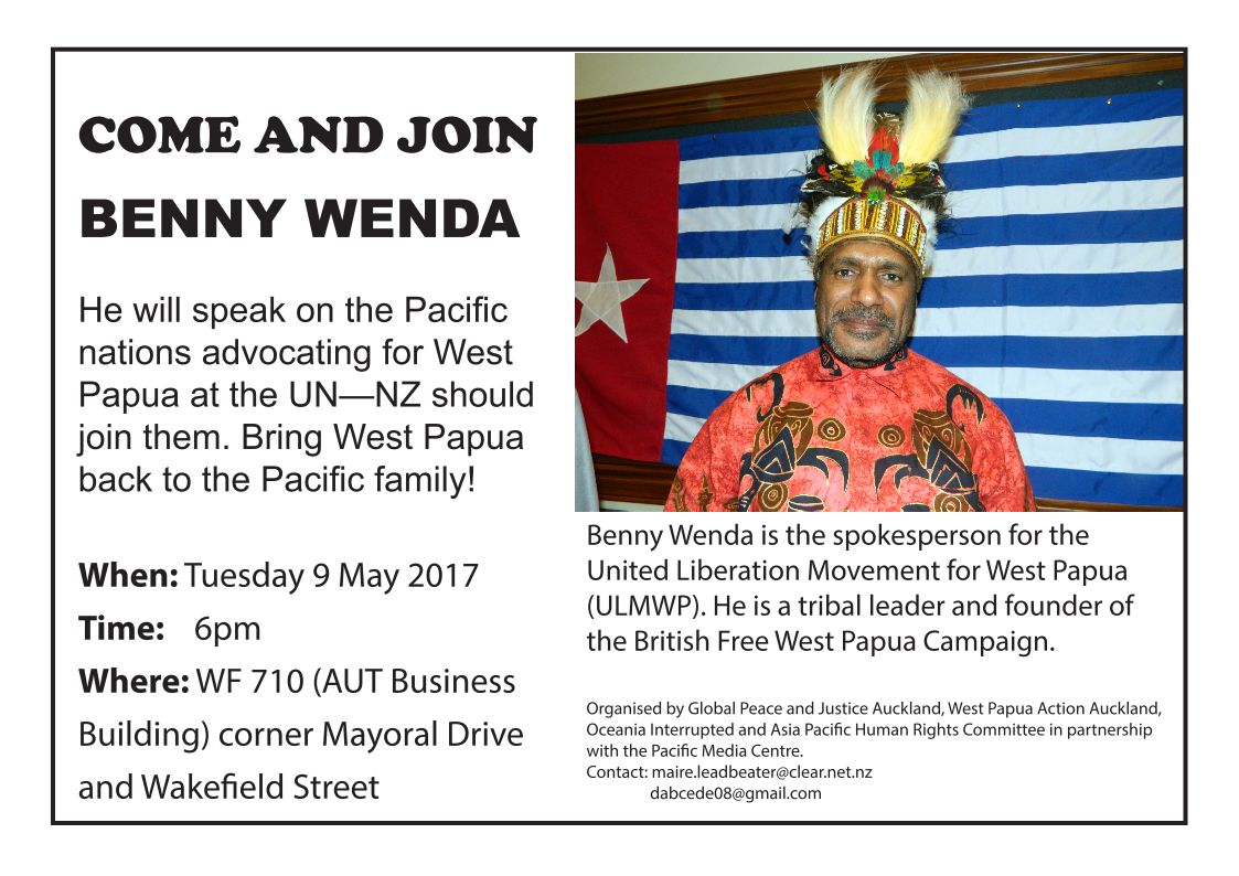 Fortunately, West Papua has new friends, the seven Pacific nations led by Vanuatu and the Solomon Islands who have raised the issue at the United Nations. New Zealand should join them to make it eight. In his Wellington meetings Benny will discuss this opportunity with MPs, Government officials and NGOs. He then travels to Christchurch for a full schedule of meetings before heading to Tai Tokerau to meet with local iwi. Schedule below.
