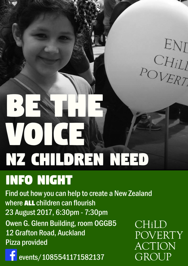 Be the voice New Zealand children need! Children in poverty don’t get any choices – and they need your voice. As our nation’s next leaders, economists, teachers, doctors and nurses, writers, social workers, policy experts (the list goes on!) you hold the power to enact change, so that together we can achieve the New Zealand we want. We would like to invite you join us on Wednesday 23 August at the University of Auckland for a kōrero about ways to be a voice for New Zealand’s children.