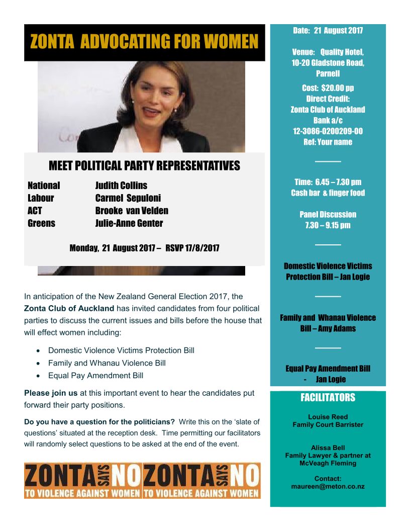 Monday 21 August: Zonta Club of Auckland is holding a Meet-the-Politicians eveningin Parnell to discuss legislation affecting women