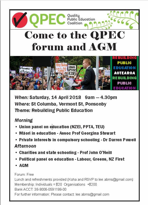 This forum addresses some pressing issues that the new Government and sector are grappling with in order to rebuild a high quality, well-funded, and accessible public education system, as outlined in the forum programme. Please see the attached flyers which include the forum’s programme and our latest newsletter "The Public Voice" and send them on to encourage your members, colleagues, whanau and friends to attend.