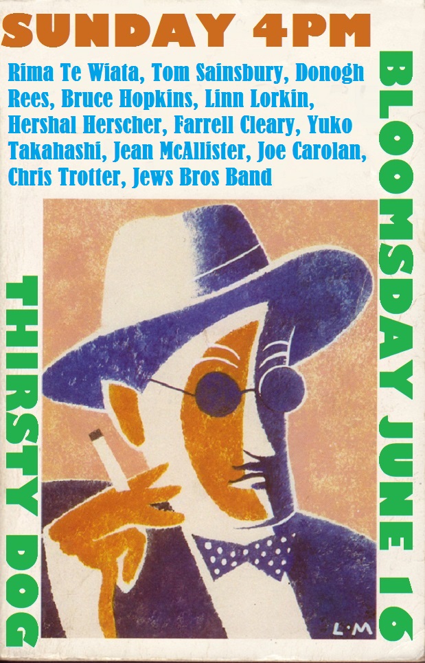 Bloomsday! Sunday, June 16, 4pm! Thirsty Dog, K Rd! Joe Carolan! Chris Trotter! Rima Te Wiata, Tom Sainsbury, Donogh Rees, Bruce Hopkins, Linn Lorkin, Hershal Herscher, Farrell Cleary, Yuko Takahashi, Jean McAllister, Karel Radek & the Jews Brothers Band!
