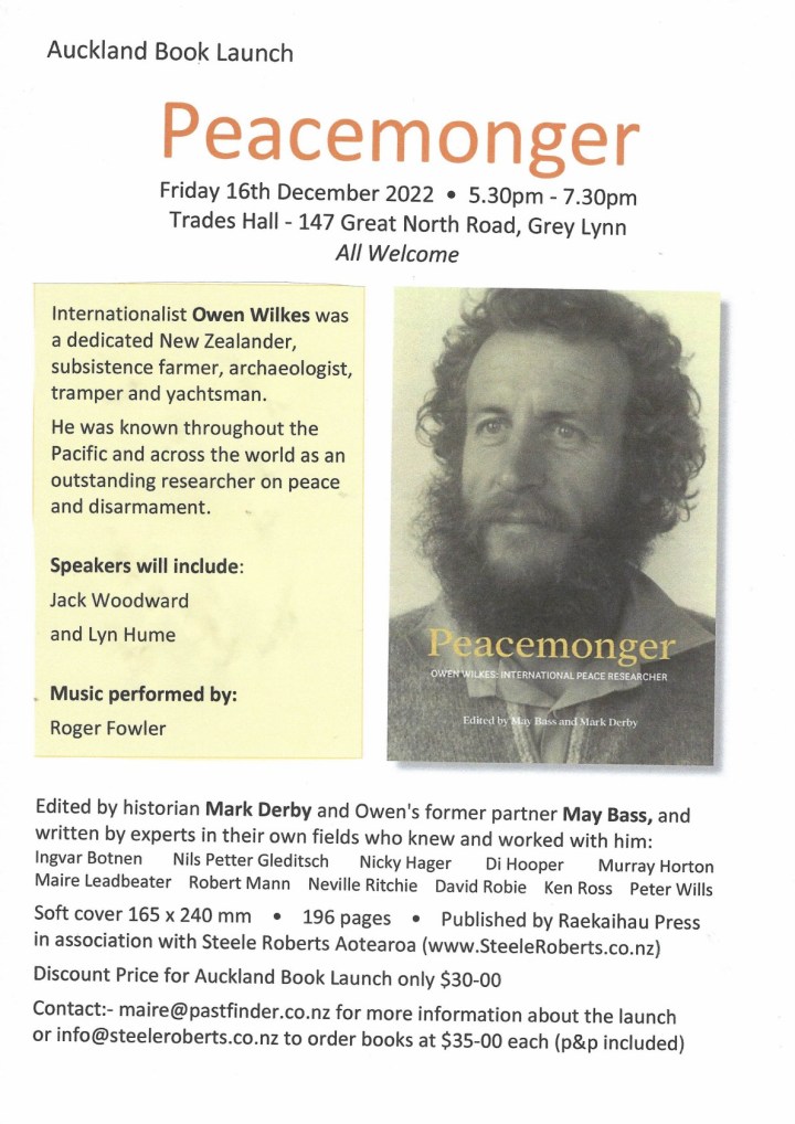 Peacemonger: Owen Wilkes: International Peace Researcher, edited by Mark Derby and May Bass. Discount price for Auckland Launch $30.00