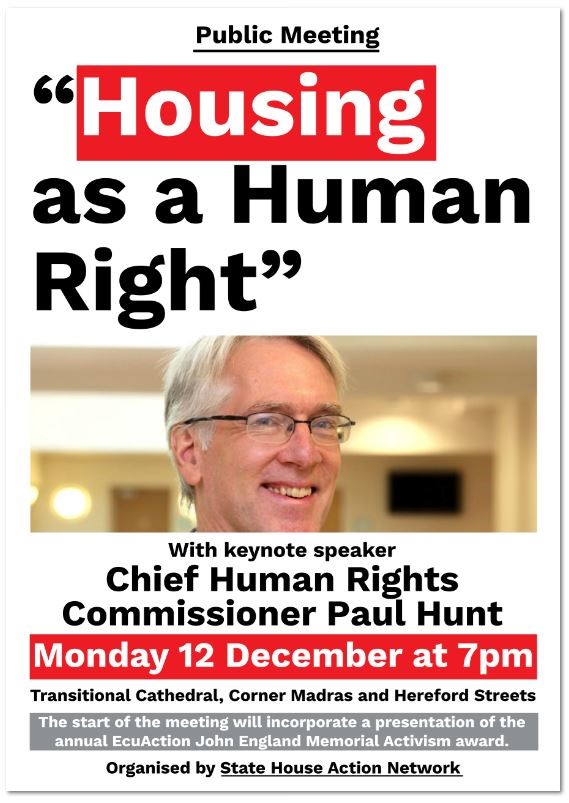We have organised this meeting in Christchurch for 12 December and would encourage other centres to invite the Chief Human Rights Commissioner to speak at public meetings in your areas. Over the past year the Human Rights Commission has been actively promoting housing as a human right and are engaged in a wide process of consultation at the moment.