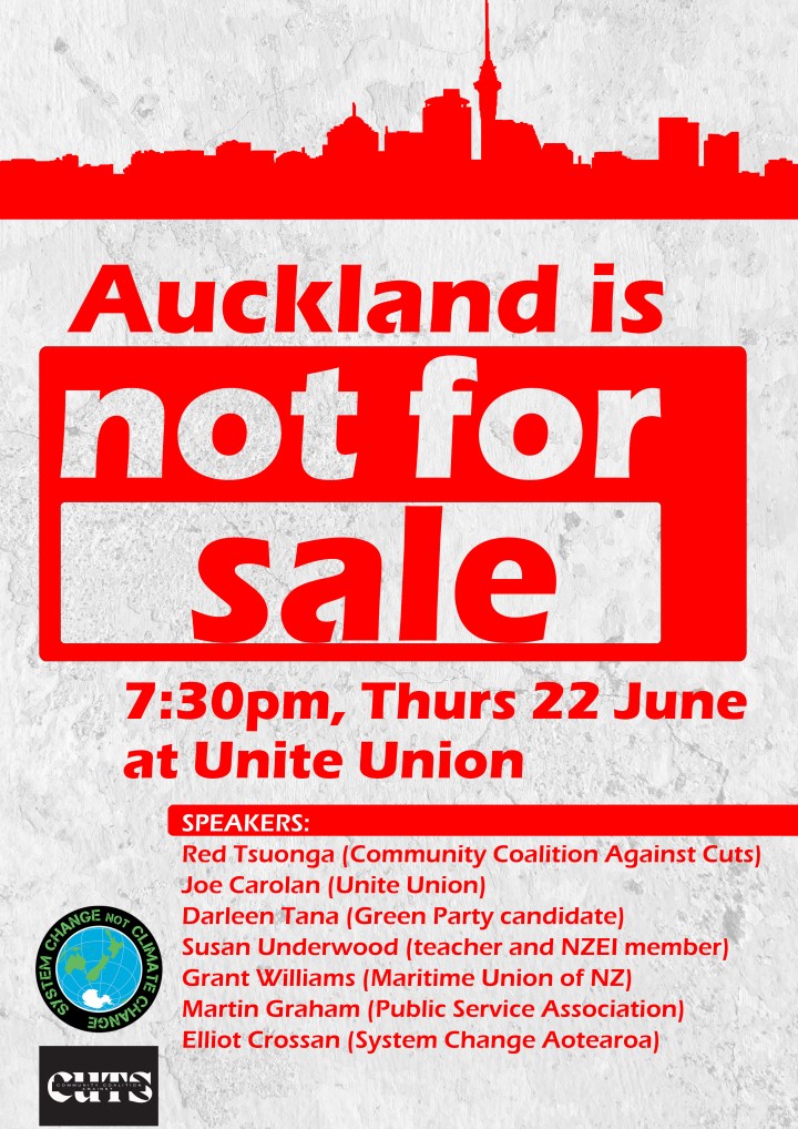 System Change Aotearoa will be hosting a public meeting on Thursday 22 June to oppose the cuts and privatisation, and to imagine a transformational, fossil-free future for Tāmaki Makaurau. The hui will be on at 7:30pm at Unite Union — 6a Western Springs Rd, Morningside.
