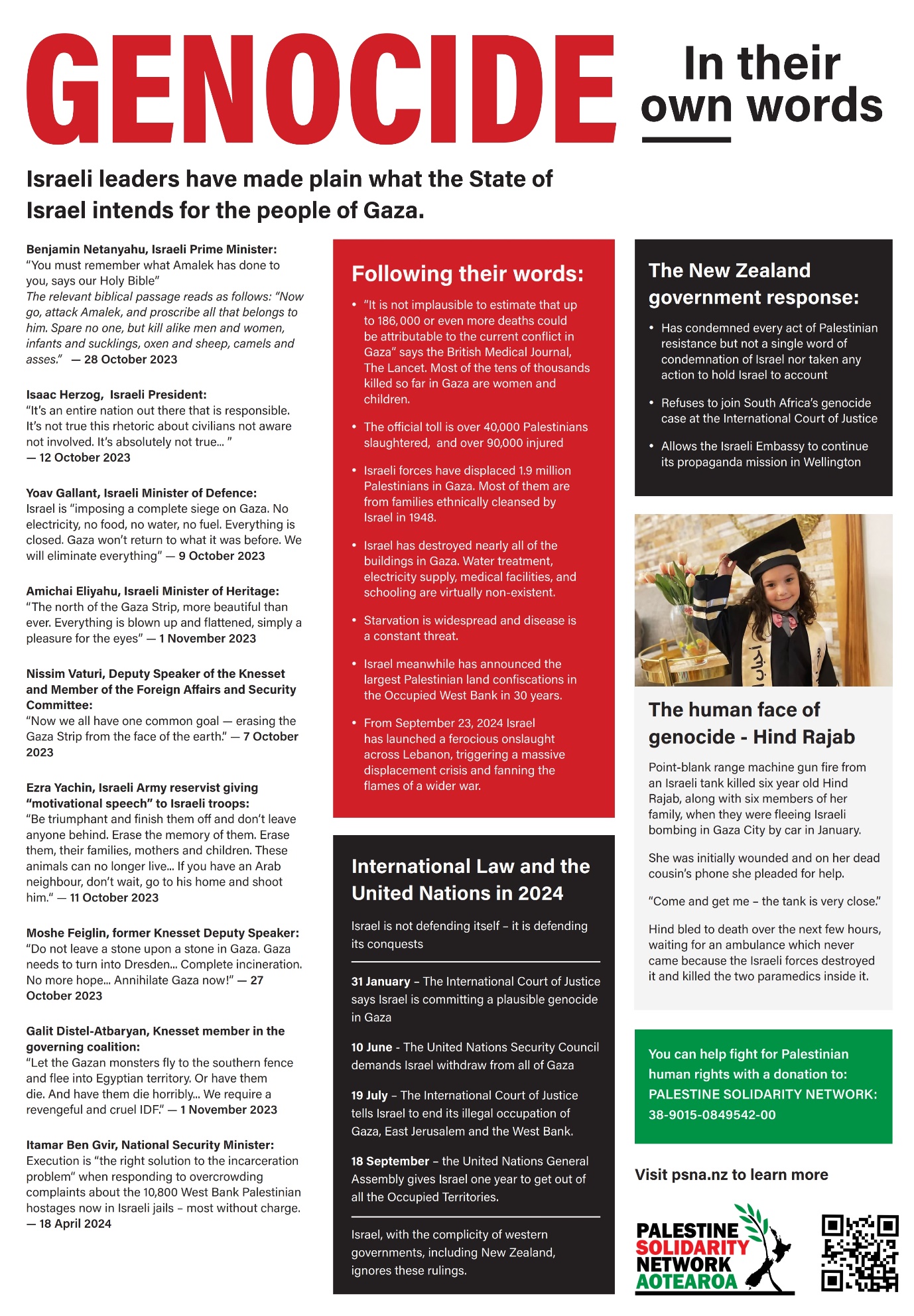 “We are incredibly proud of New Zealanders who have come out week after week for 12 months to stand with Palestine” says PSNA National Chair John Minto. “As far as we are aware this long-term pattern of solidarity has no precedent in New Zealand’s past”