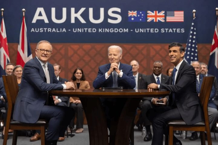 Anthony Albanese, Joe Biden and Rishi Sunak at the AUKUS announcement. [Source: lowyinstitute.org]