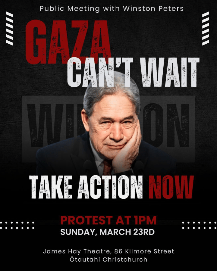 Palestine Solidarity supporters will protest New Zealand Foreign Minister Winston Peters’ “the real state of the nation” public meeting in Ōtautahi/Christchurch this Sunday from 1pm at the Christchurch Town Hall (the NZ First meeting for Peters begins at 2pm)